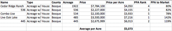 It is important with PPAR to have tighter bunch in acreage per listing. In most counties as the acreage goes up the price per acre declines. In example 1-1 above we have an outlier with 1922 acres. We had to include this property because it was one of our ranch brokerage client listings and within Bosque County, Texas there were no other ranch listings within +/- 1,000 acres of it.