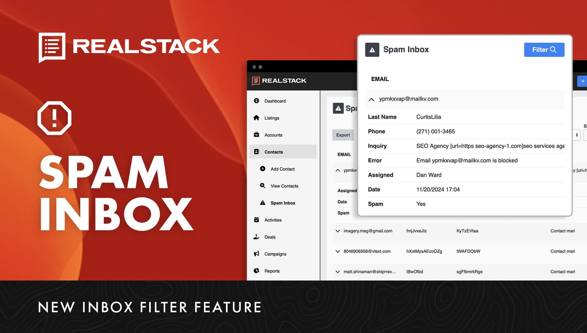 The Spam Inbox feature is now available to all REALSTACK users. To learn more about how it works, click here. If you have questions or need assistance, our support team is here to help. Reach out to us at support@realstack.com.